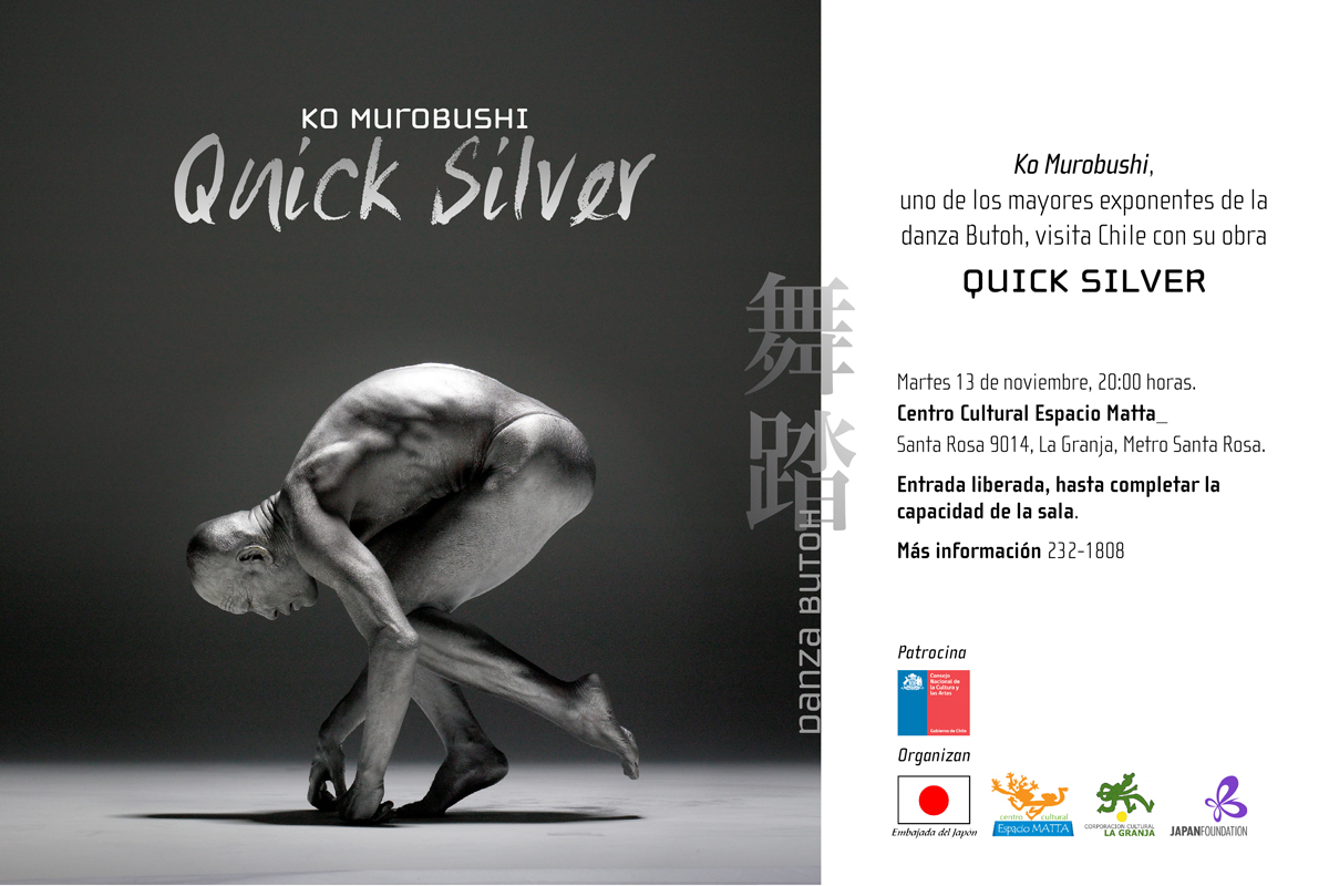 El martes 13 de noviembre, a las 20:00 horas, KO MUROBUSHI, presentará su espectáculo “Quick Silver” en el Centro Cultural Espacio Matta, metro Santa Rosa (Santa Rosa 9014, La Granja), con entrada liberada.