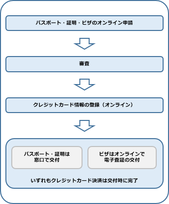 令和5年3月27日より、国内および国外の一部において、令和6年1月29日より全在外公館で旅券(パスポート)、証明の申請を電子(オンライン)申請で行った場合の領事手数料を、クレジットカードによりオンライン決済することが可能になりました。